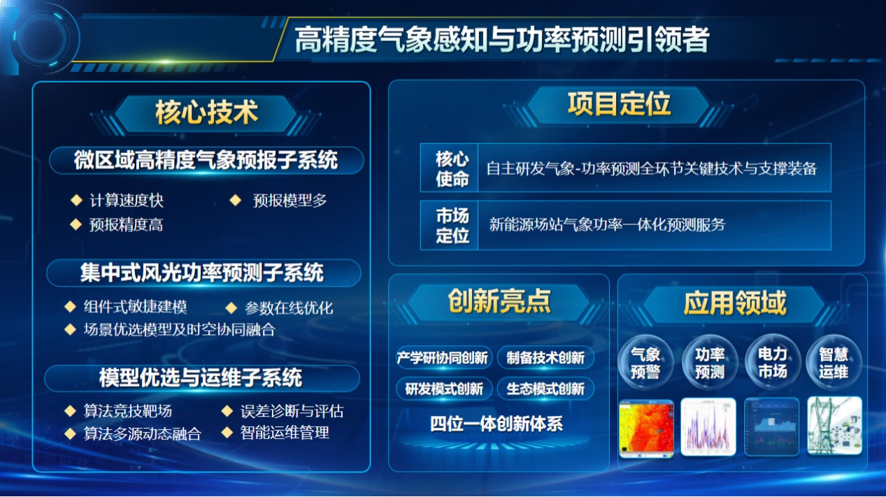 《新能源場站氣象-功率預測一體化系統》為三峽高科與三峽科創園合作完成,該成果集突破新能源場站微區域高精度氣象預報和功率預測技術,研發多源氣象預報和功率預測模型;創新提出“場景匹配-算法優選-動態集成”的閉環預測體系,自主研發氣象-功率一體化“數智”預測平臺,實現場站高精度高可靠“靶向”功率預測。