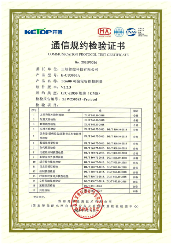 目前,TG系列全國產(chǎn)化智能勵磁系統(tǒng)已通過工信部電子五所全國產(chǎn)化認證和代碼安全審計、中國電科院型式試驗認證、華北電科院涉網(wǎng)性能檢測、開普實驗室“國家智能電網(wǎng)自動化設(shè)備及系統(tǒng)質(zhì)量檢驗檢測中心”智能電站通信規(guī)約(IEC61850)檢測。